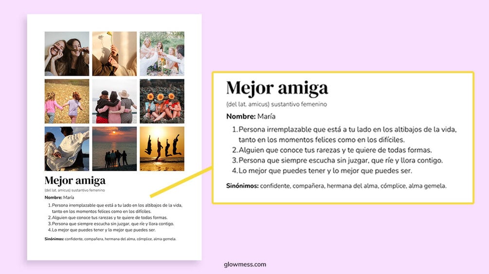 Este diseño incluye una elegante definición estilo diccionario de "Mejor Amiga", usando descripciones divertidas y emotivas, aunque puedes editarlas a tu gusto. El texto es el siguiente: